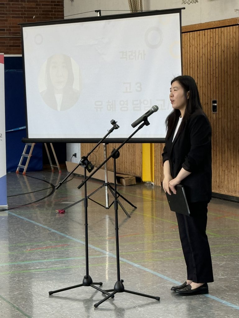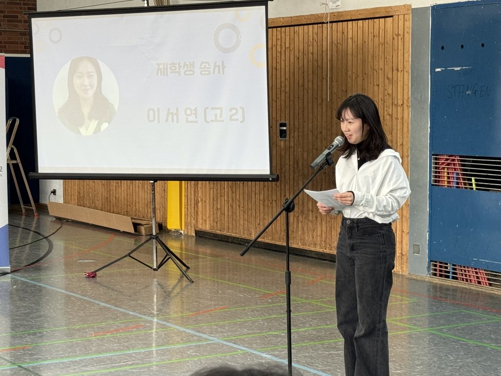 졸업식에는 졸업생과 학부모, 축하객, 일부 재학생 등 총 150여 명이 참석했으며, 이날의 특별한 무대를 빛내기 위해 이지선 주독일한국교육원장과 김병구 프랑크푸르트한국한교 운영위원장도 함께 참석했습니다. 심은주 교장은 이 자리를 빌어 “꿈을 향한 노력과 자기반성의 중요성”을 강조했습니다.